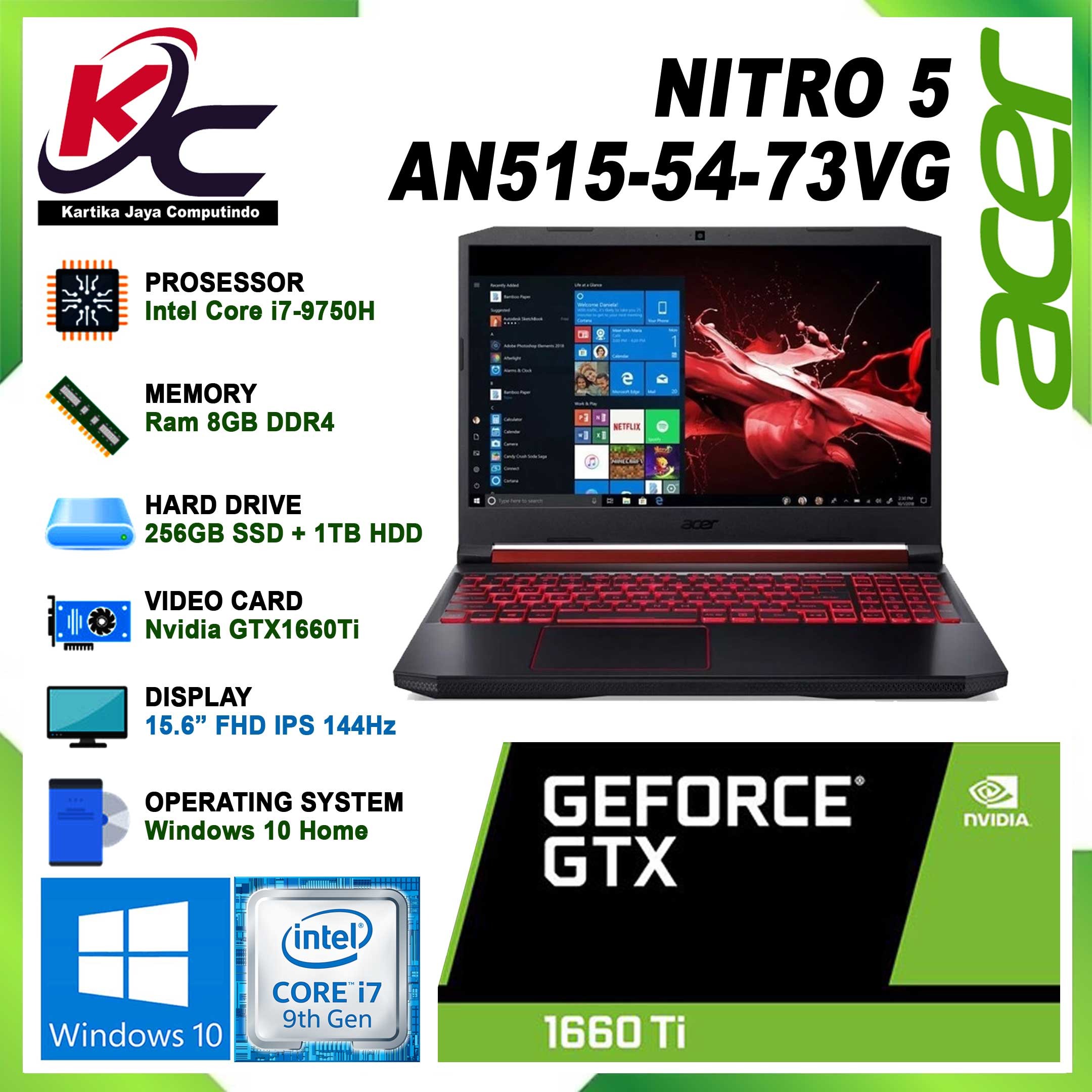 ACER NITRO AN515-54-73VG I7-9750 8GB 256SSD+1TB HDD 1660Ti 6GB