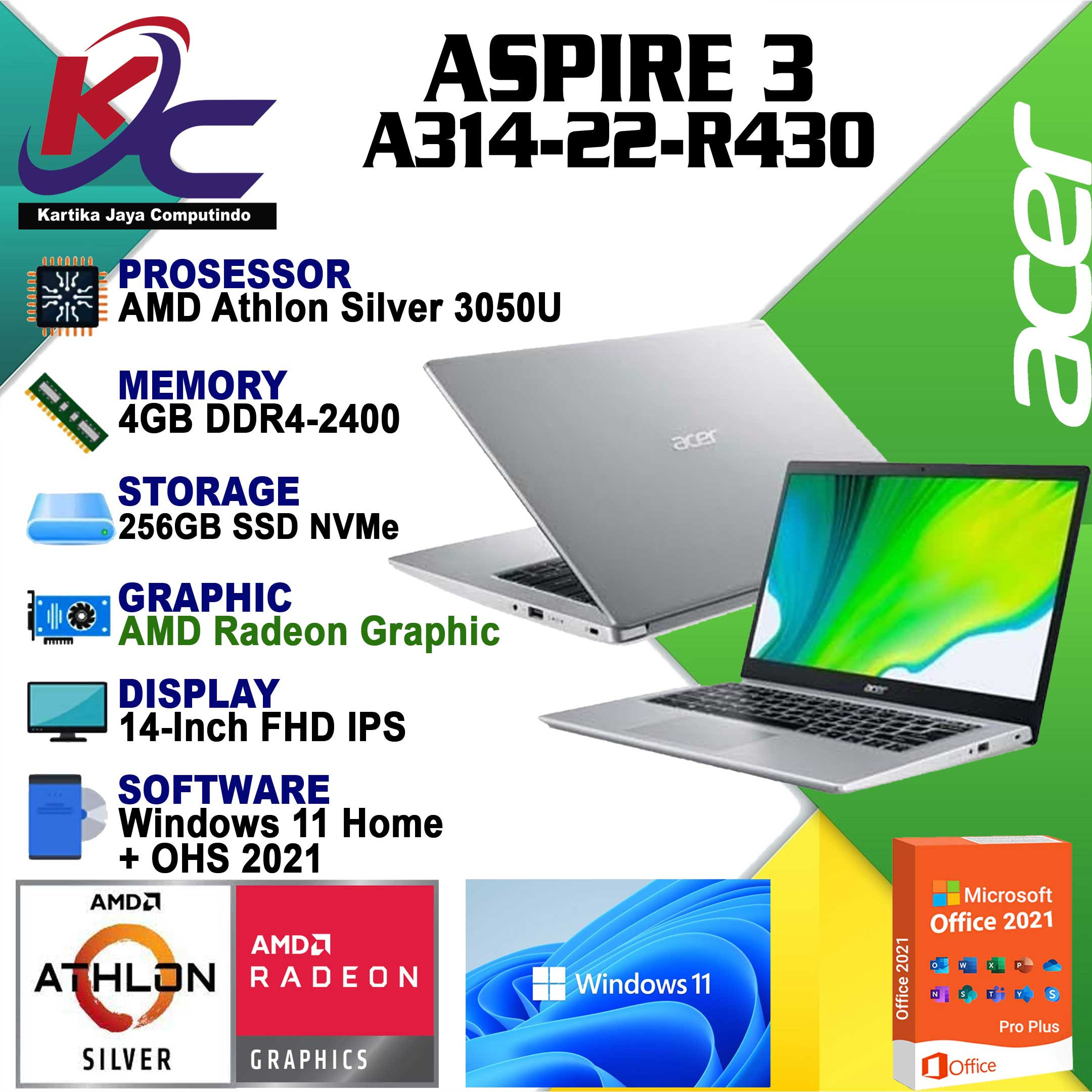 - Prosesor : AMD Athlon Silver 3050U 2.3 UP to 3.2 GHz 4 MB L3-Cache.