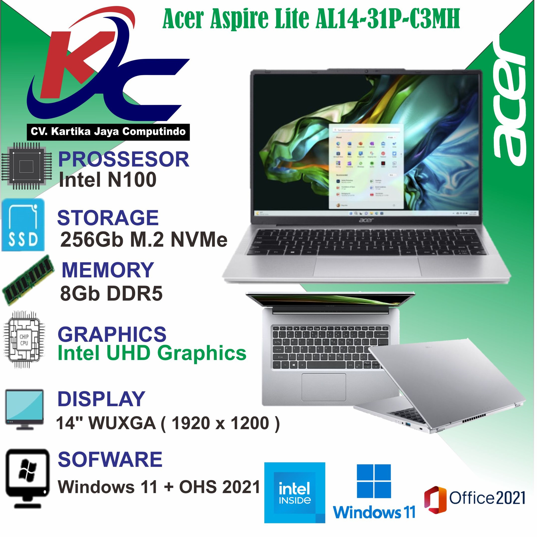 - Prossesor : Intel® Processor N100 (4 Cores, 4 Threads up to 3.40 GHz)